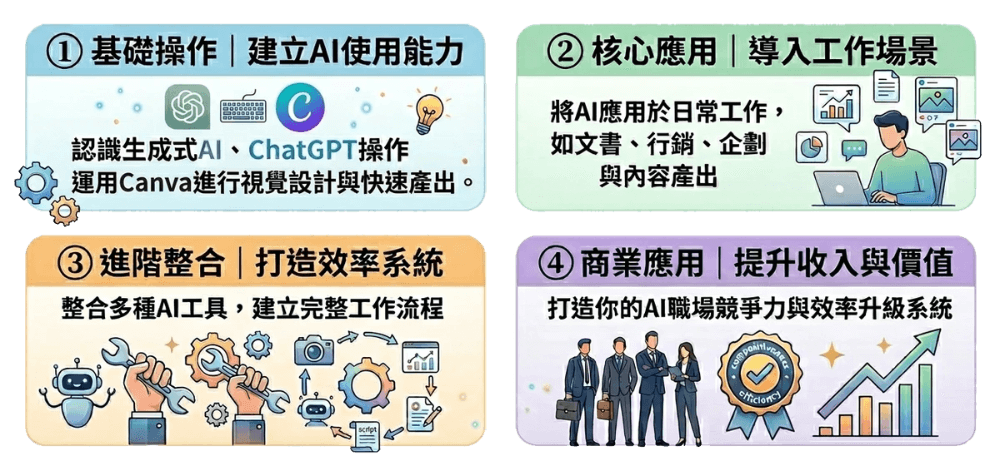 首先從基礎操作開始,建立AI使用能力,認識生成式AI的原理、ChatGPT操作邏輯與基本應用方式;接著進入核心應用階段,將AI實際導入日常工作場景,包括文書處理、行銷企劃與內容產出等應用;再進一步延伸至進階整合,學習如何整合多種AI工具,打造完整且高效率的工作流程;最後進入商業應用層級,將AI能力轉化為職場競爭力與效率升級系統,進一步提升個人價值與收入潛力。